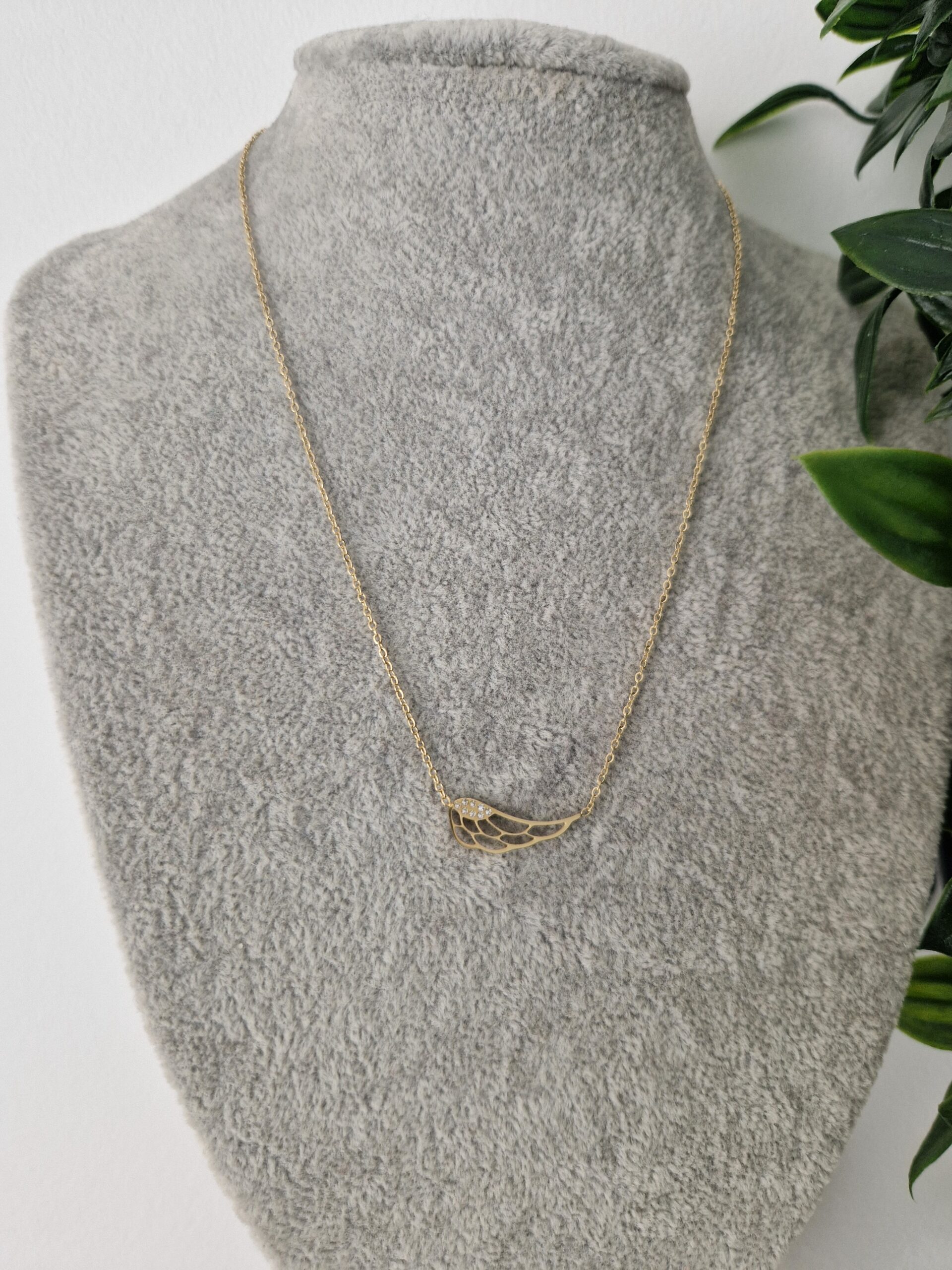 This stainless steel gold wing necklace features a unique and stylish design that combines the durability of stainless steel with the elegance of gold. The necklace features intricately detailed wings on a delicate chain, creating a statement piece that is perfect for adding a touch of glamour to any outfit. The gold plating adds a touch of luxury and sophistication, while the stainless steel ensures that the necklace is long-lasting and resistant to tarnishing. This necklace is perfect for those who love to make a statement with their accessories and is sure to be a striking addition to any jewelry collection.