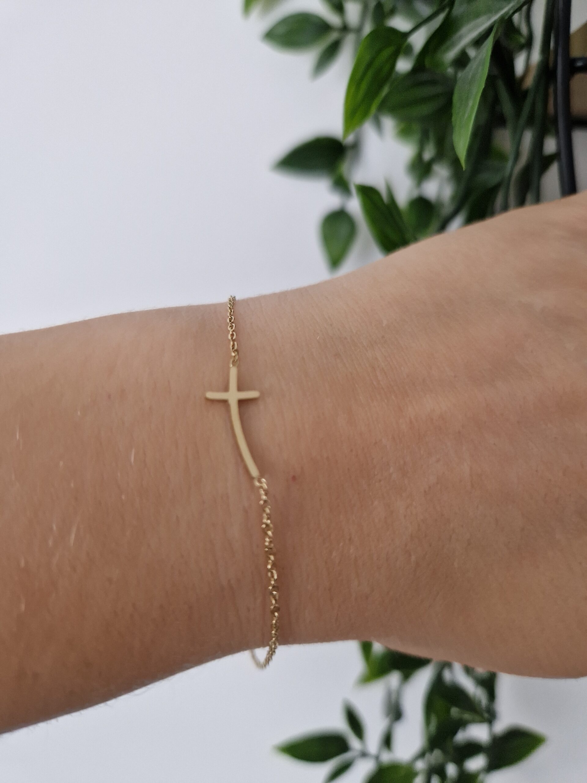 This delicate bracelet features a simple gold cross charm on a fine chain, offering a subtle yet elegant touch. Perfect for everyday wear, it adds a graceful and meaningful accent to any outfit.