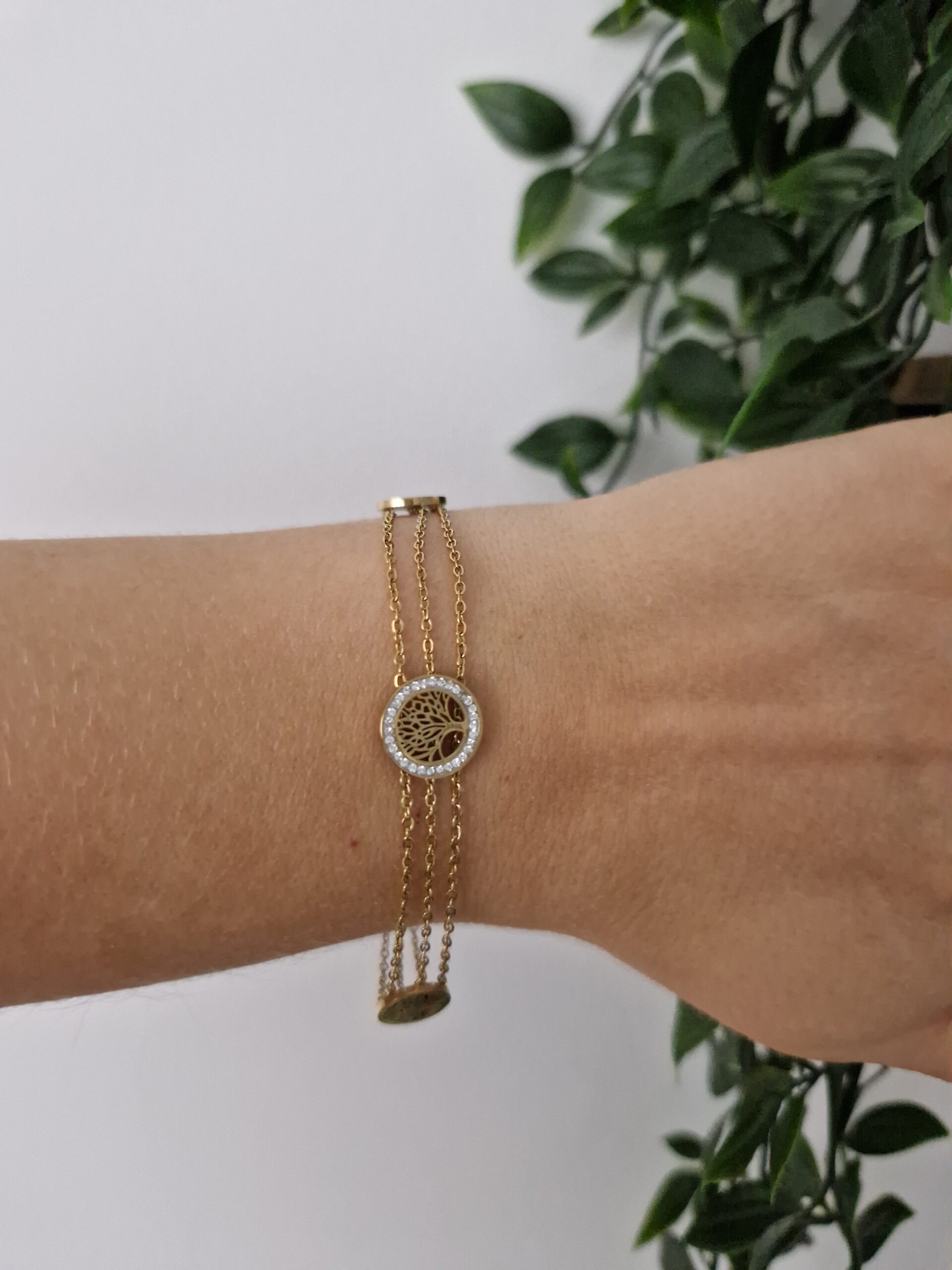 This elegant bracelet features a gold Tree of Life charm, encircled by shimmering stones, and is accentuated by a delicate double chain design. Symbolising growth and strength, it adds a sophisticated and meaningful touch to any ensemble.