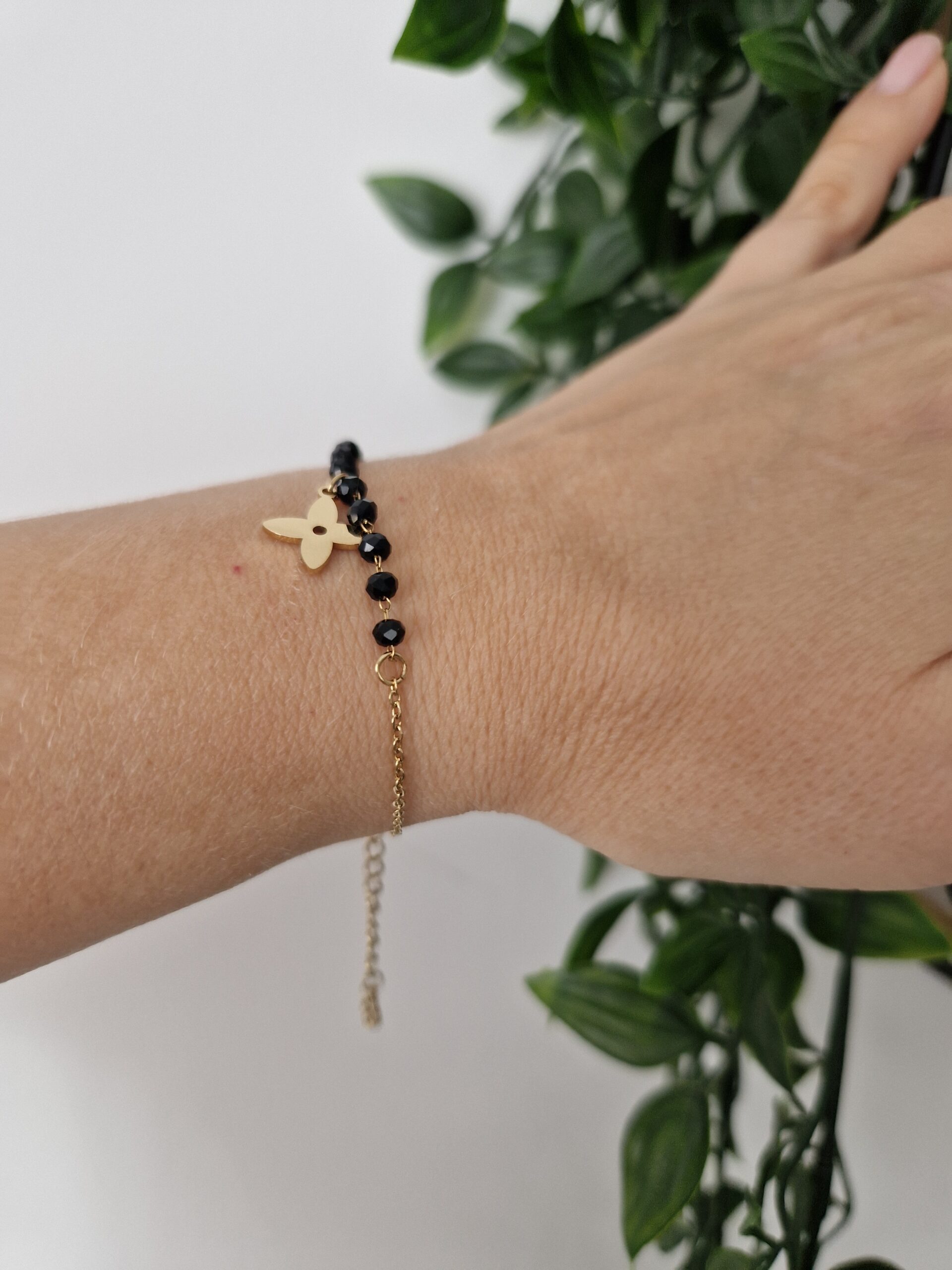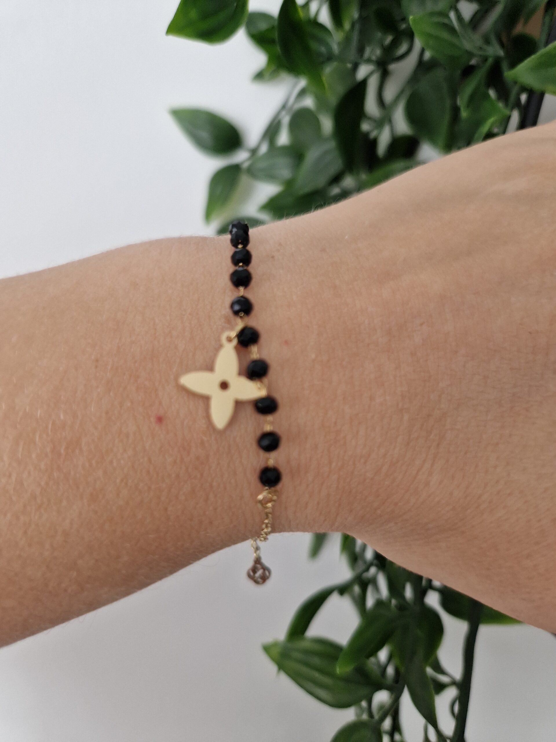 This elegant bracelet features a combination of black beads and a delicate gold chain, adorned with a charming Lilou flower charm. Perfect for adding a touch of sophistication and whimsy to any outfit, it blends playful design with refined style.