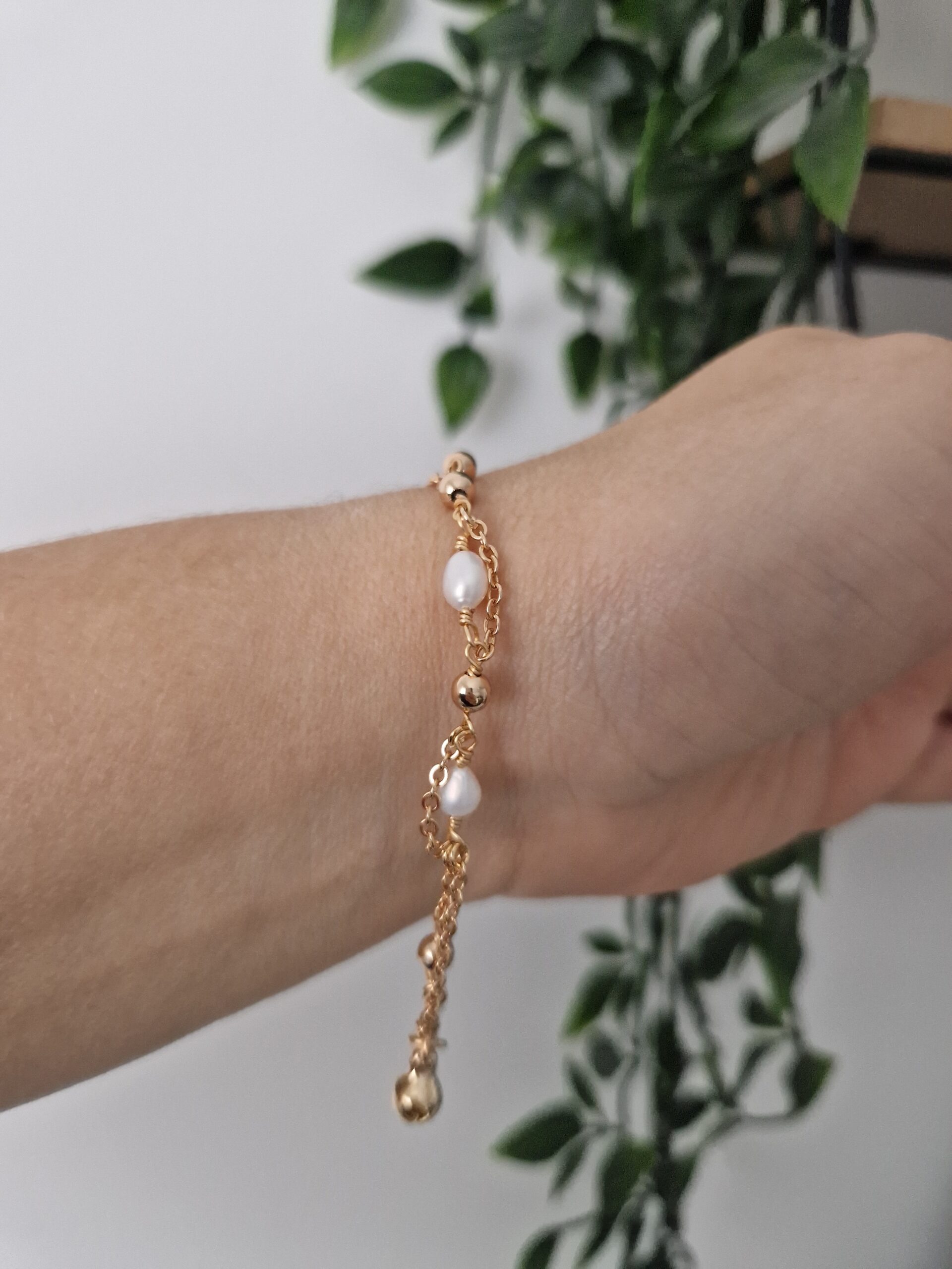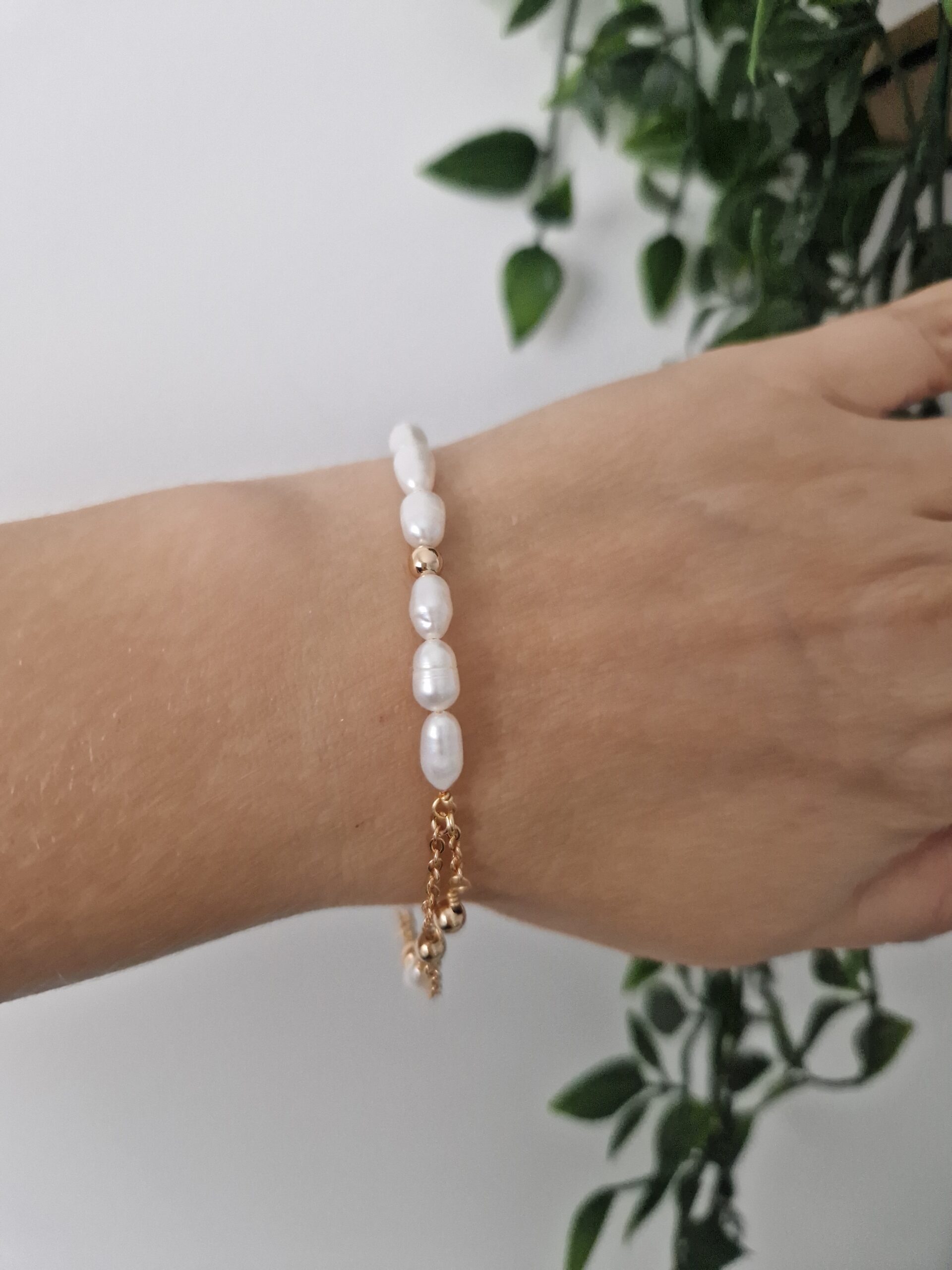 This elegant bracelet features a string of lustrous pearls complemented by a delicate rose gold chain. Perfect for adding a touch of sophistication and timeless beauty to any outfit, it seamlessly blends classic charm with modern elegance.