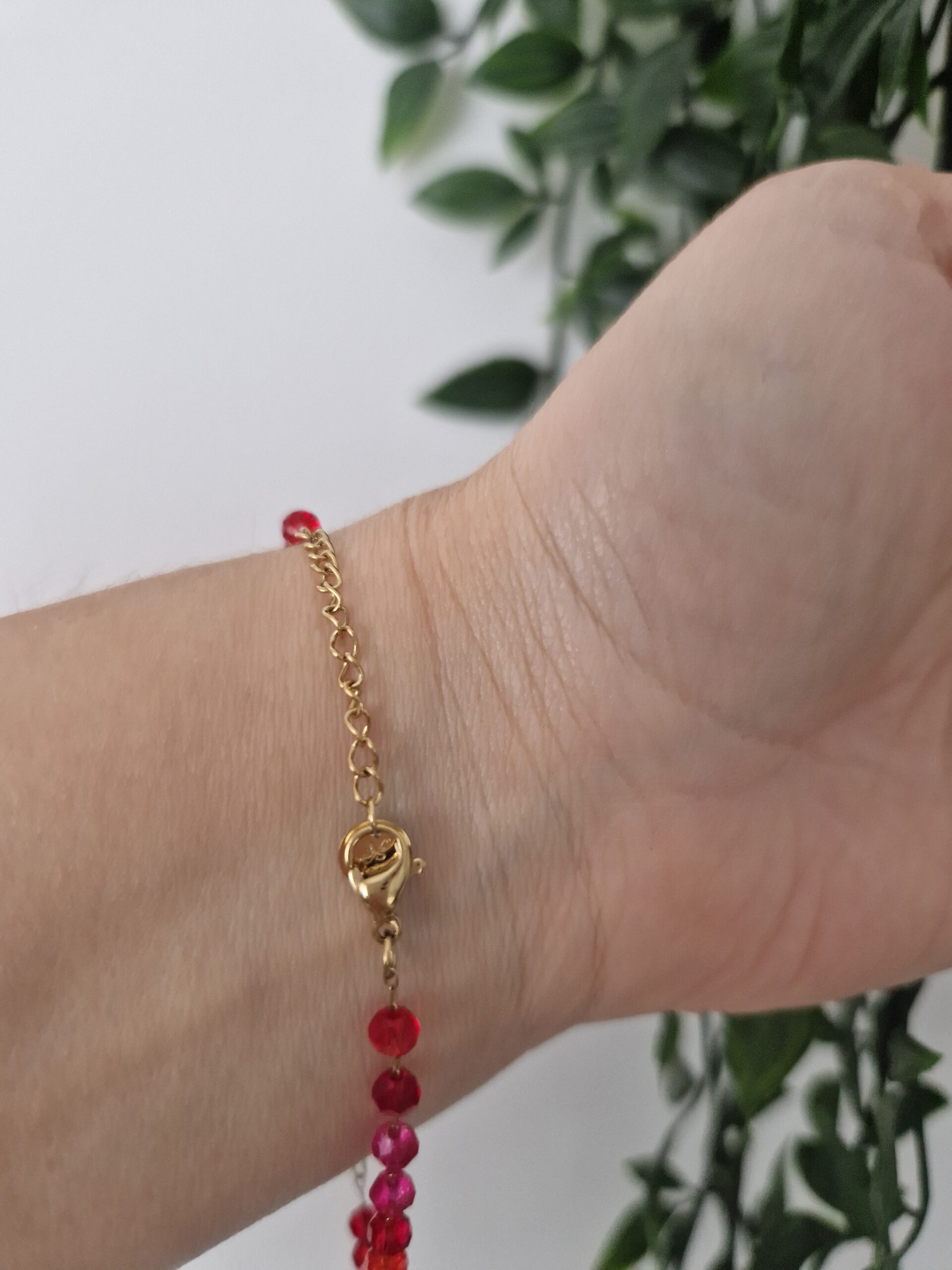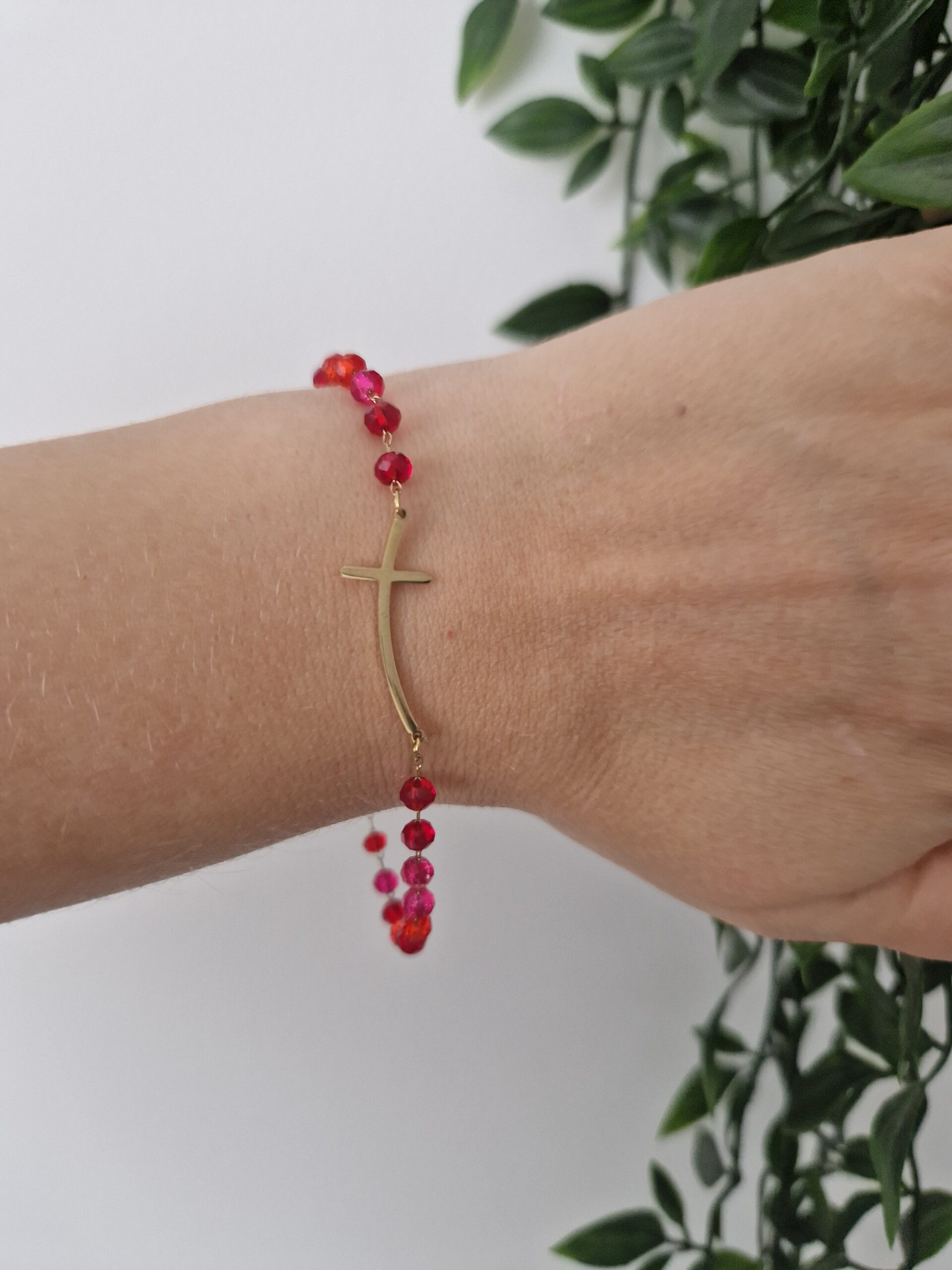 This beautiful bracelet features a gold cross charm paired with vibrant red beads, creating a striking contrast. It’s a perfect accessory for adding a touch of elegance and colour to your everyday look.