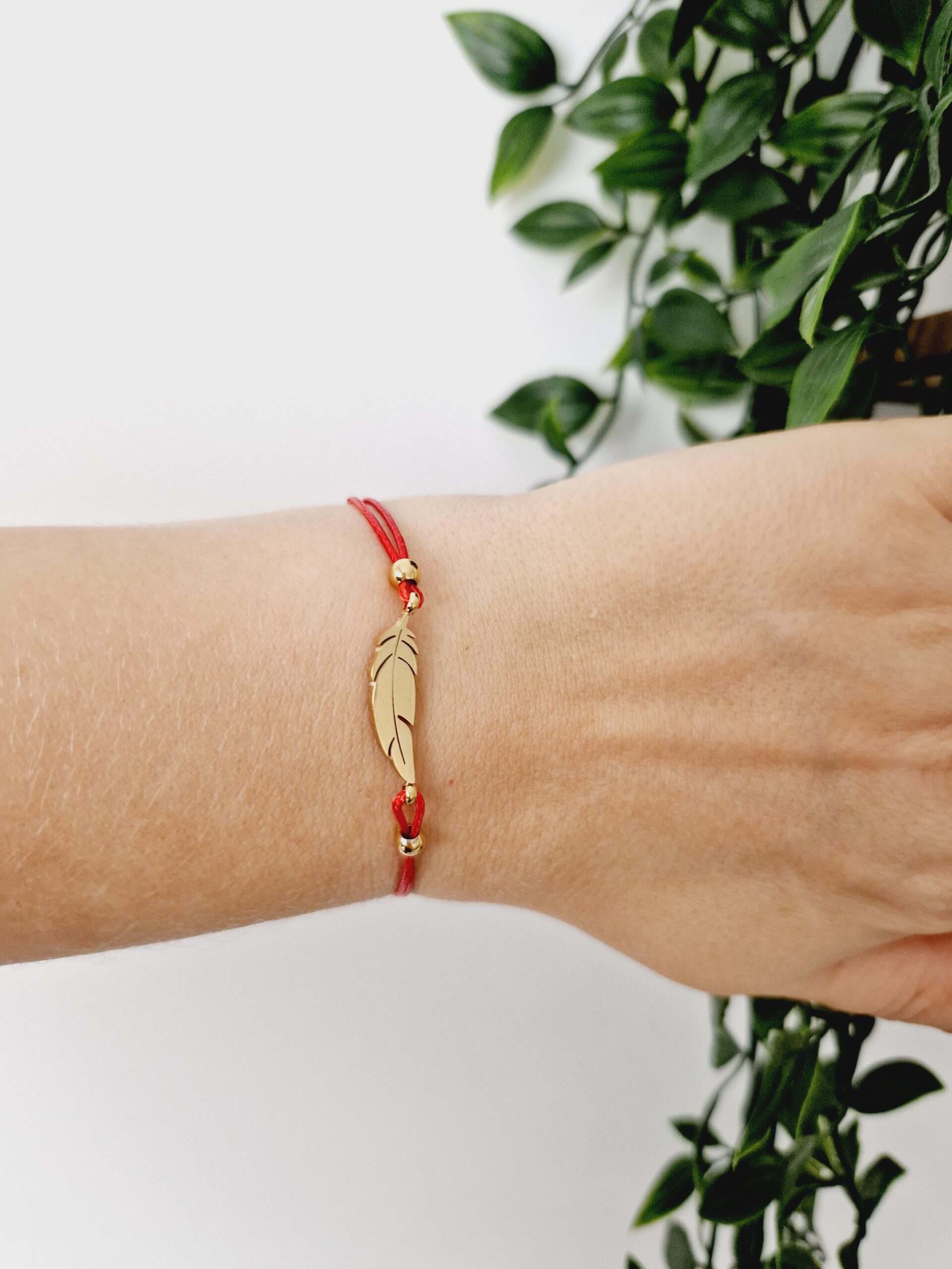 This elegant bracelet features a vibrant red cord with a delicate gold feather charm. Perfect for adding a touch of whimsical elegance to any outfit, it symbolises freedom and grace with its refined design.