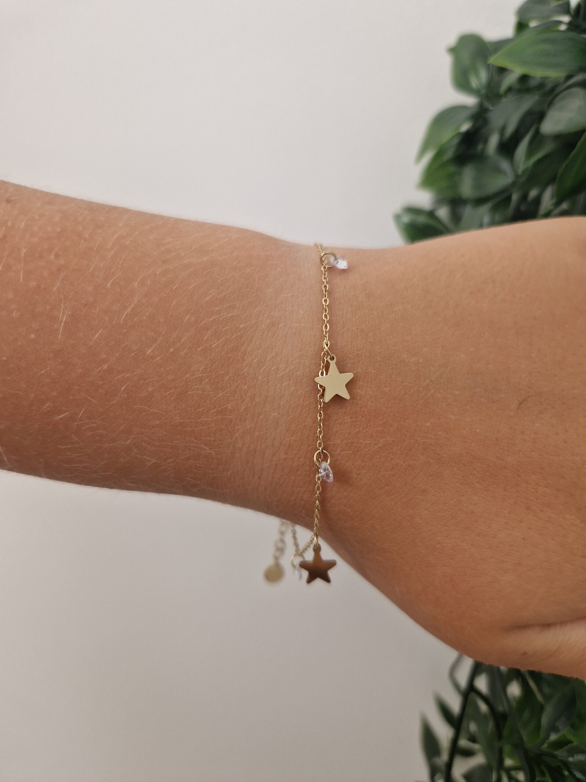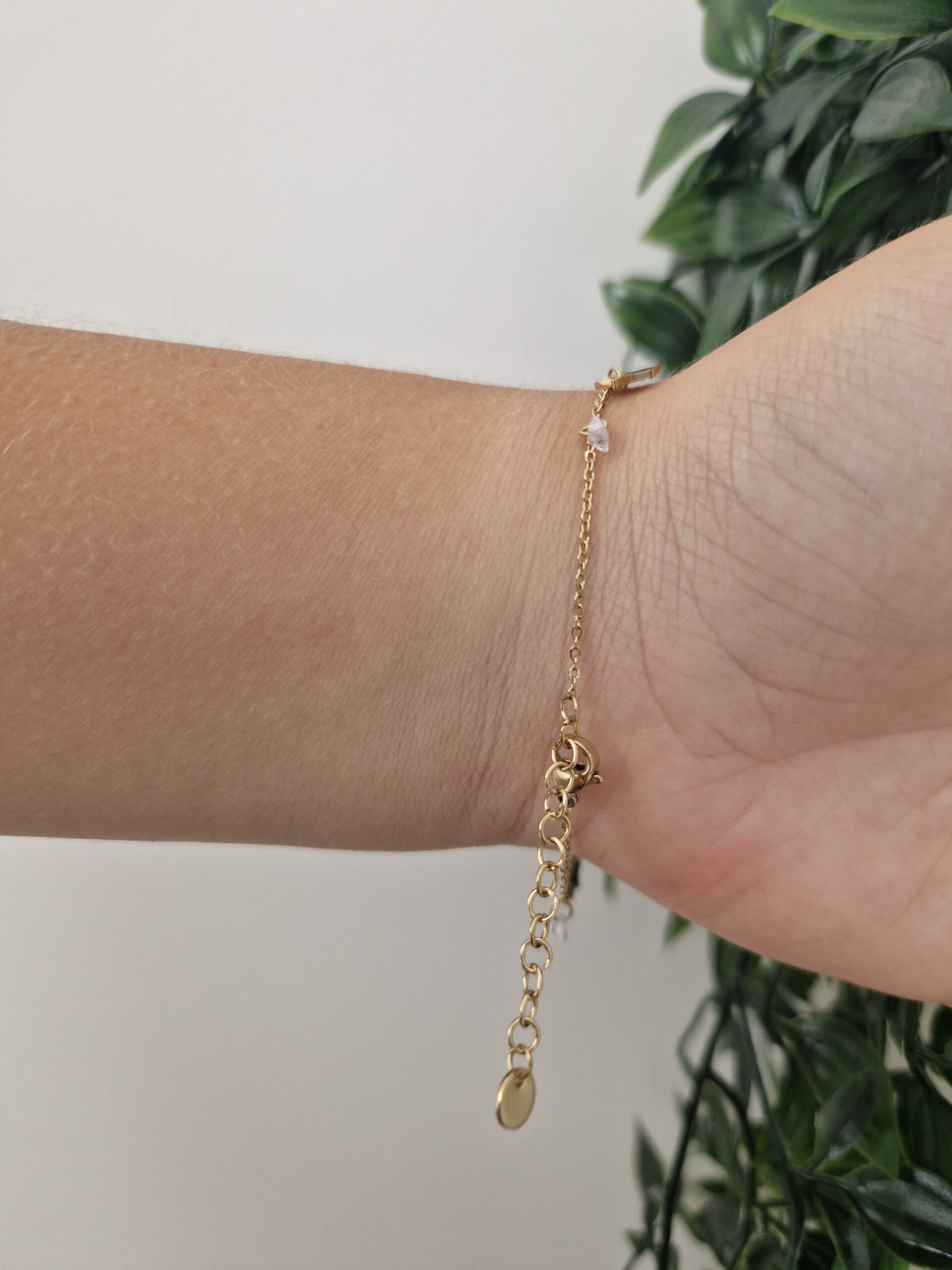 This elegant gold bracelet features a bold chain with a sparkling crystal-studded charm, adding a touch of glamour and sophistication. Perfect for enhancing any outfit, it combines classic design with modern elegance.