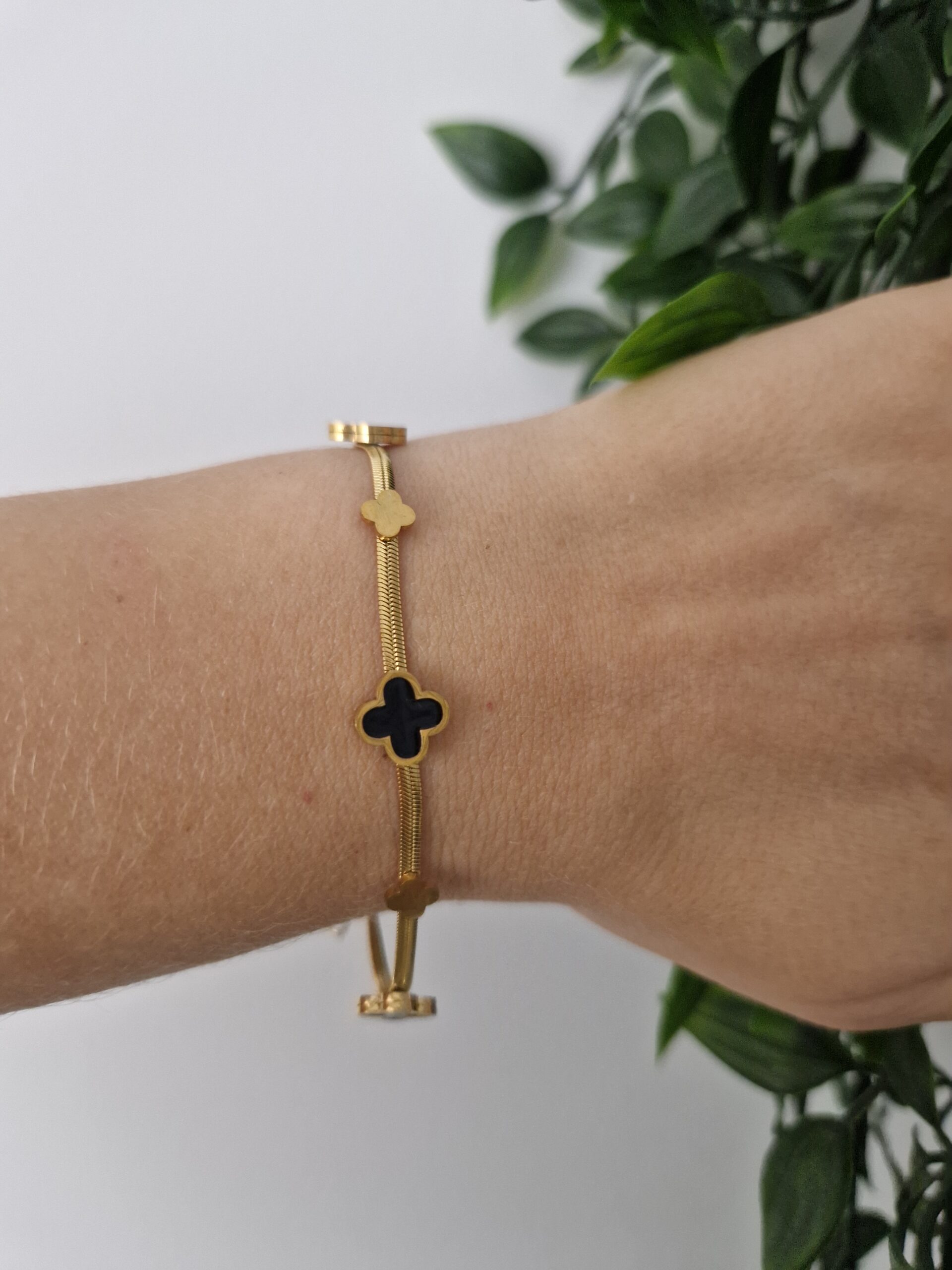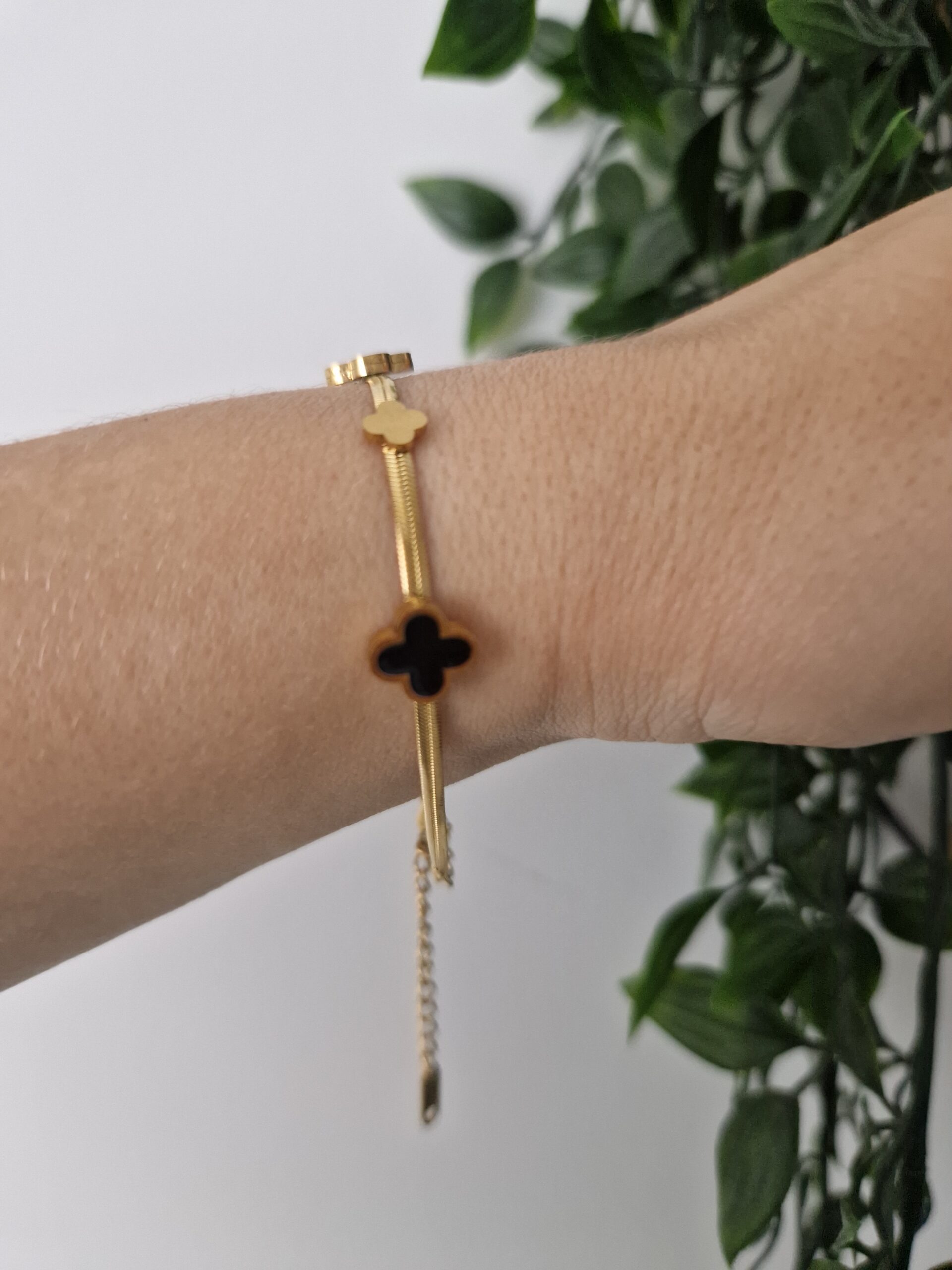 This elegant bracelet features a gold chain adorned with black and gold clover-shaped charms. Perfect for adding a touch of sophistication and luck to any outfit, it combines timeless design with modern flair.