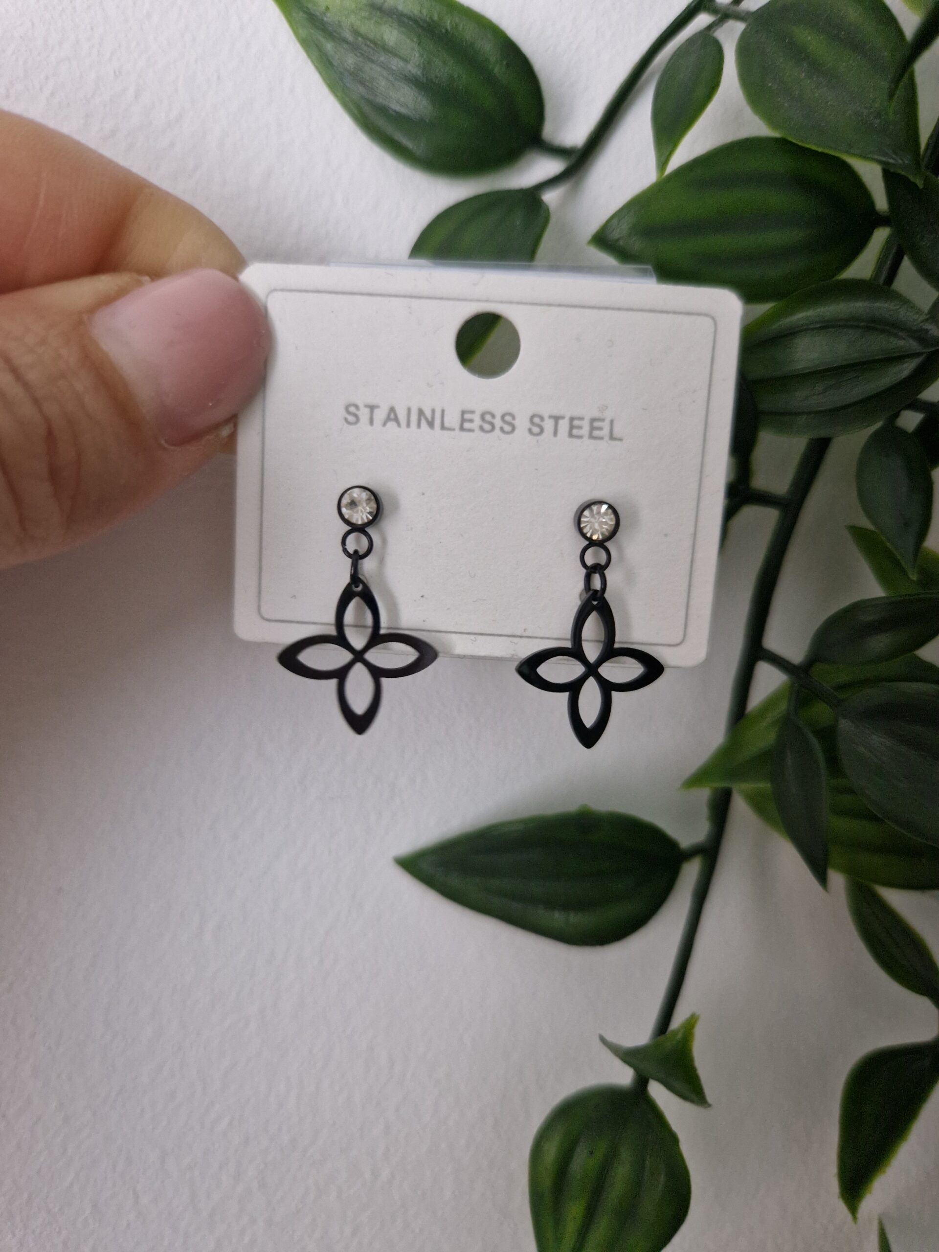 These stylish black Lilou stud earrings, crafted from stainless steel, feature a delicate floral design dangling from sparkling studs. Their unique and elegant style adds a touch of sophistication and charm, perfect for any occasion.