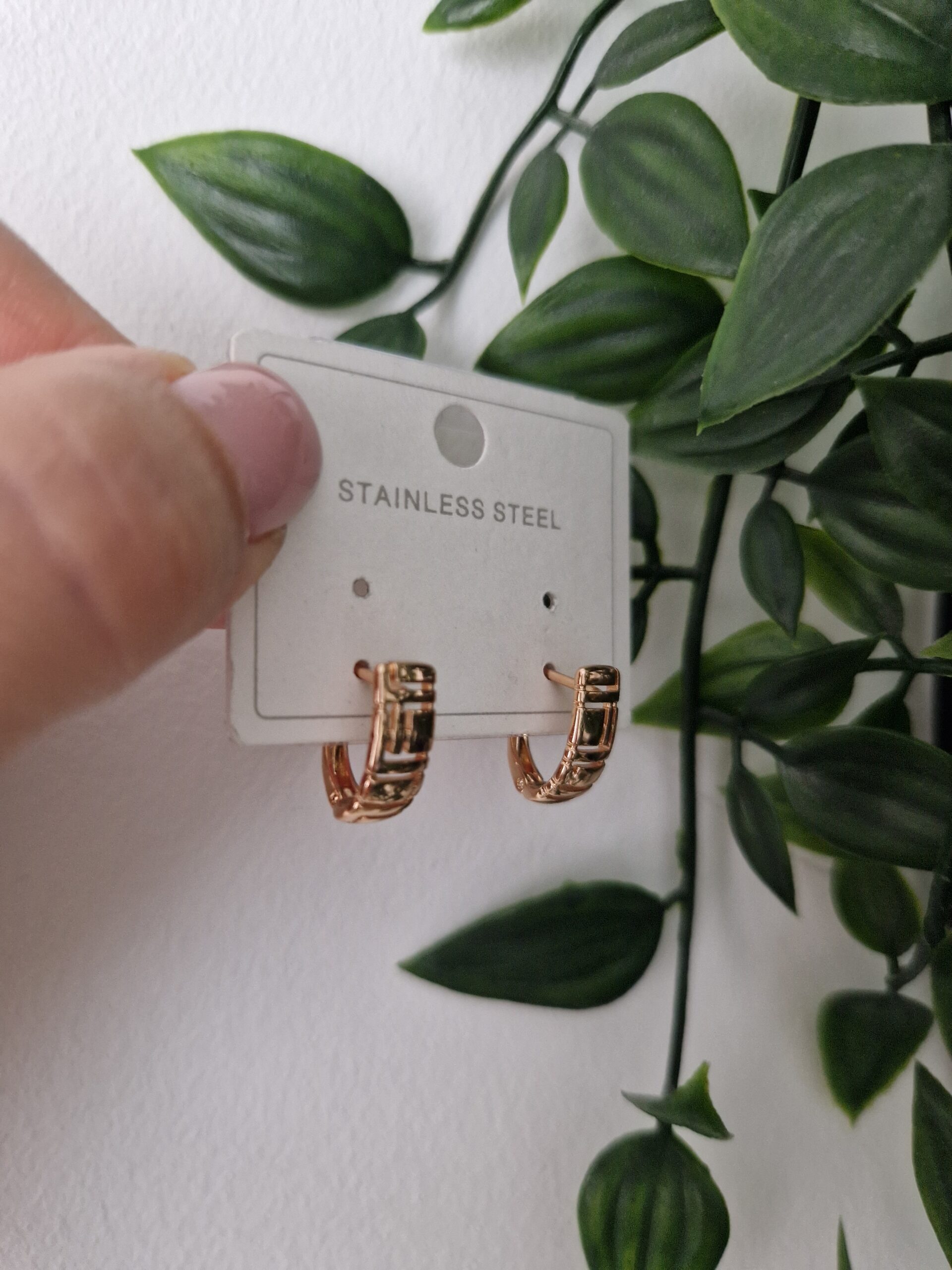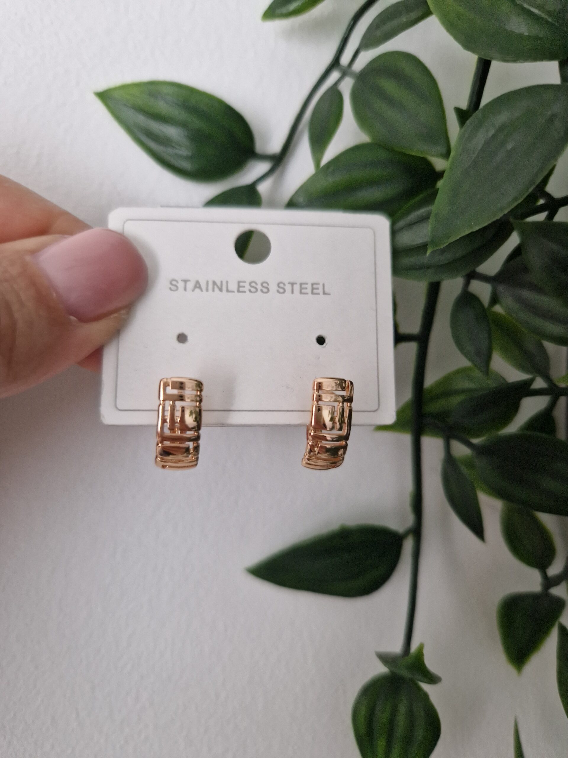 These stylish gold earrings feature a modern geometric design. Crafted from stainless steel, their intricate pattern adds a touch of contemporary elegance, making them a perfect accessory for both casual and formal occasions.