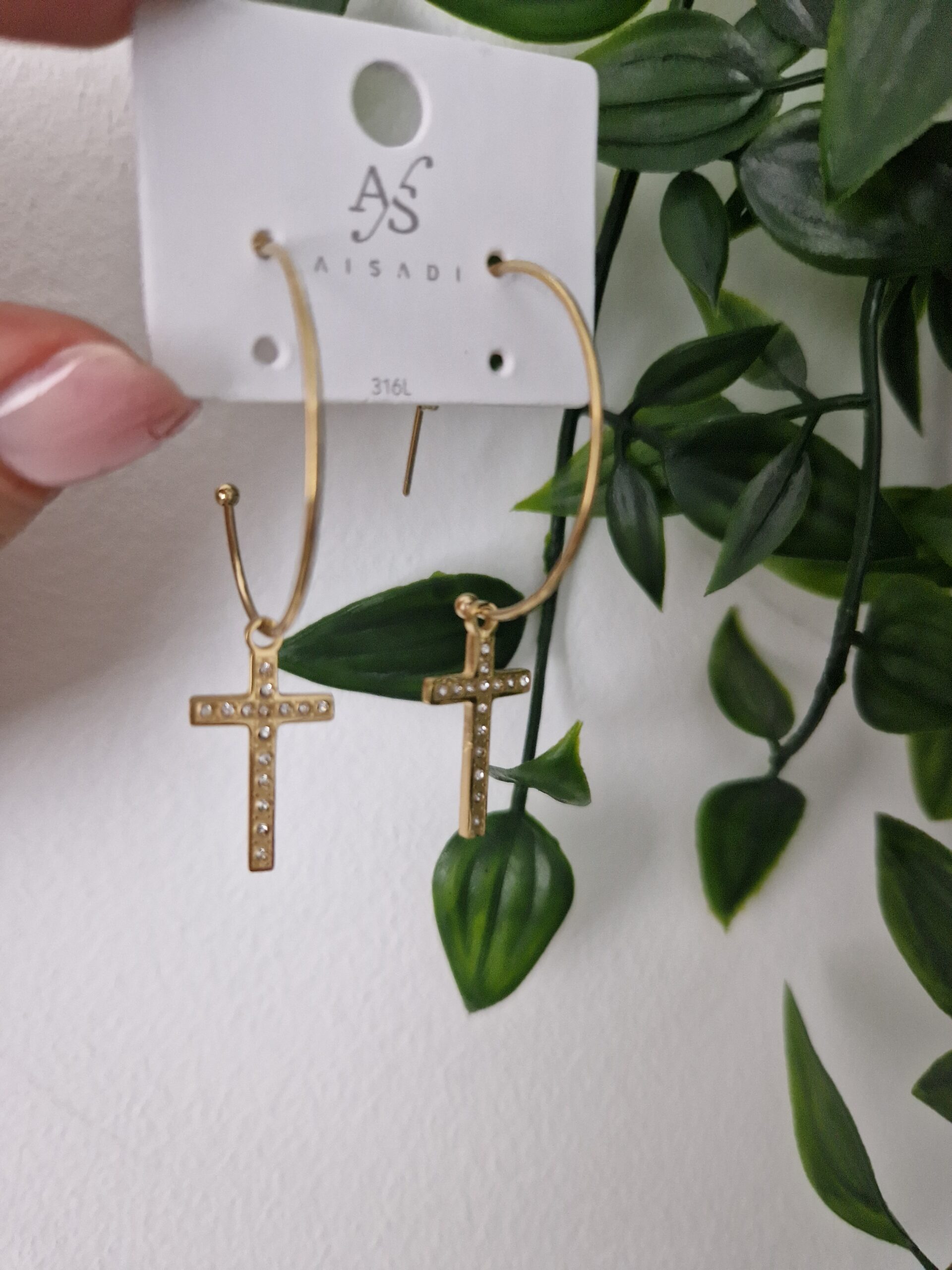 These stylish gold cross hoop earrings feature a sleek and modern design. The elegant gold hoops are adorned with delicate cross pendants, adding a touch of contemporary elegance and faith-inspired charm to any outfit.