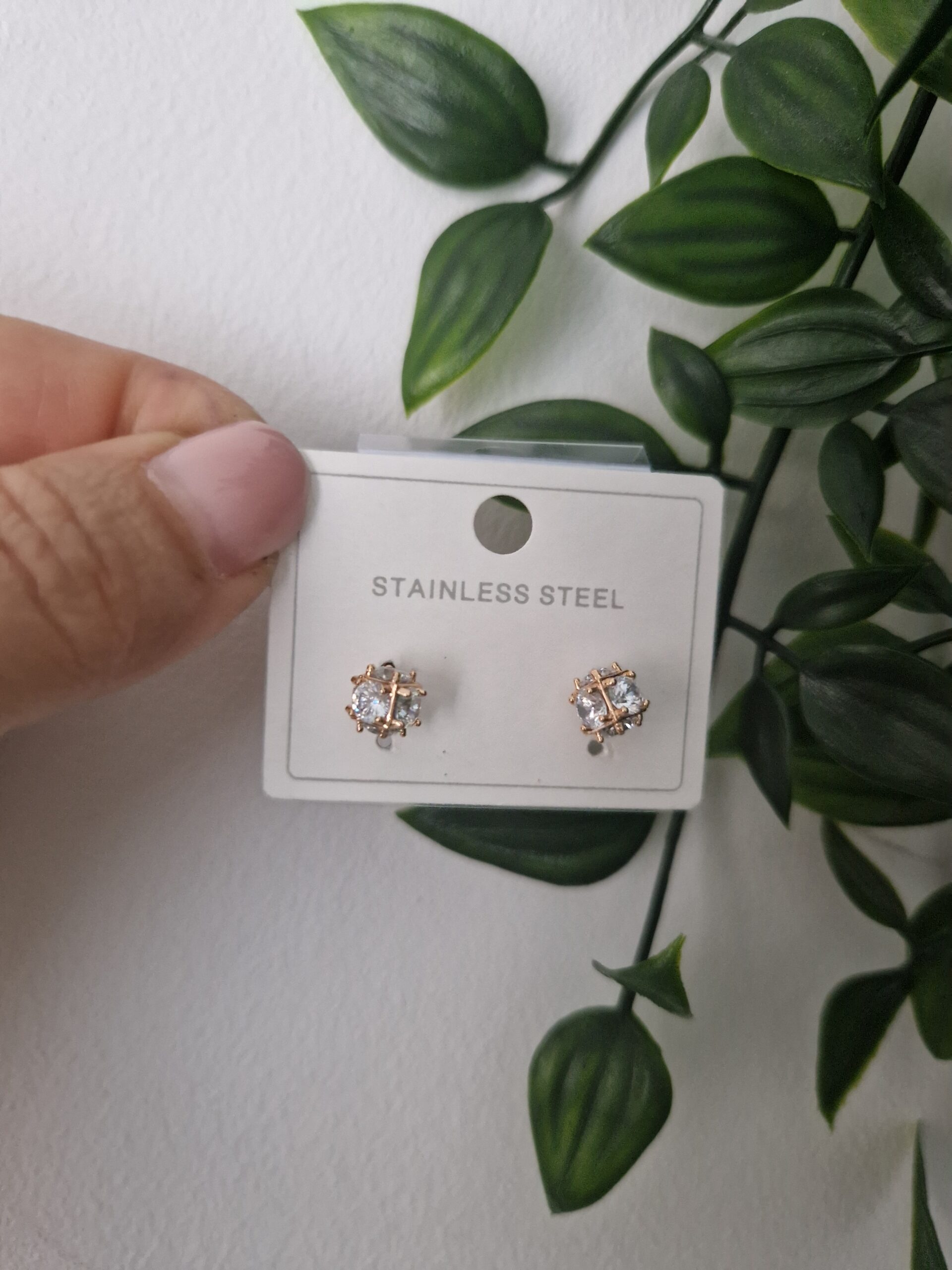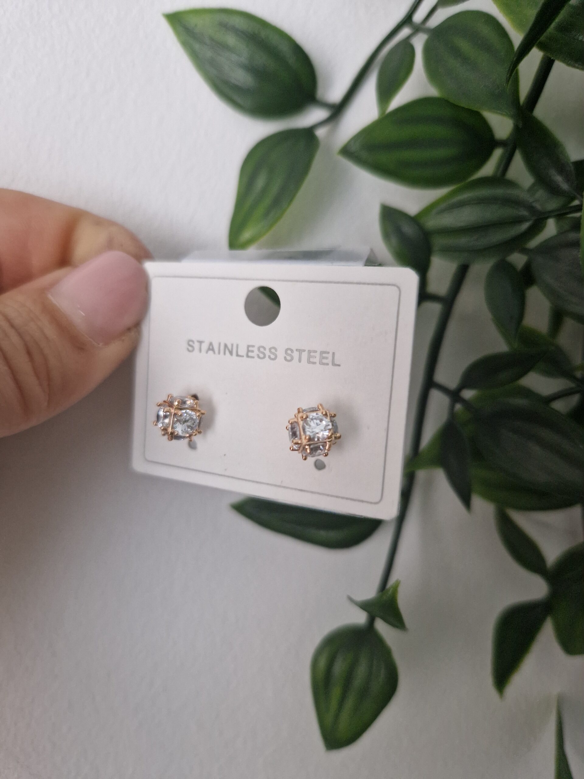These stunning gold studs feature sparkling zirconia stones set in a classic design. Crafted from stainless steel, their elegant and timeless appearance makes them a perfect accessory for adding a touch of glamour to any outfit.