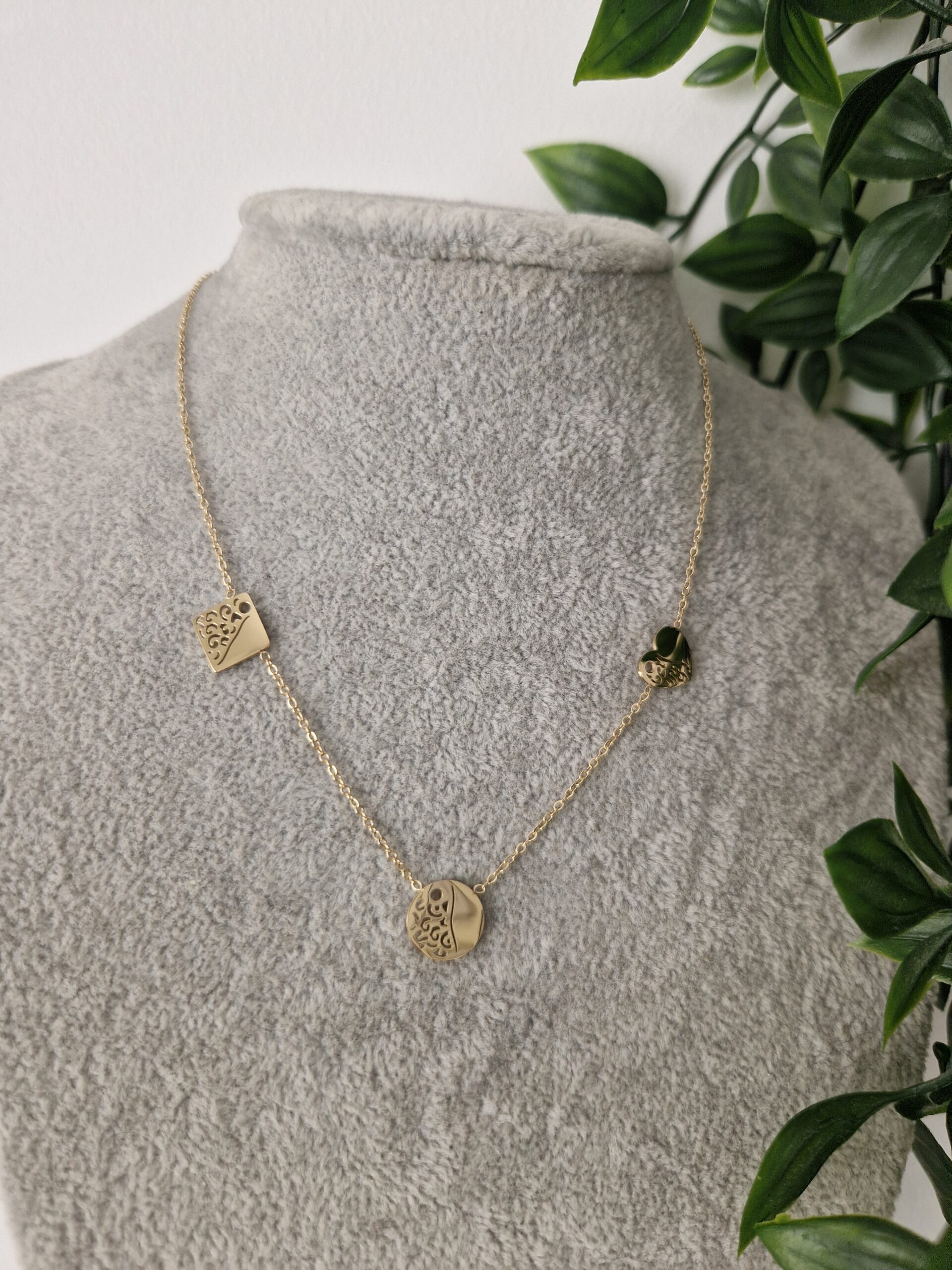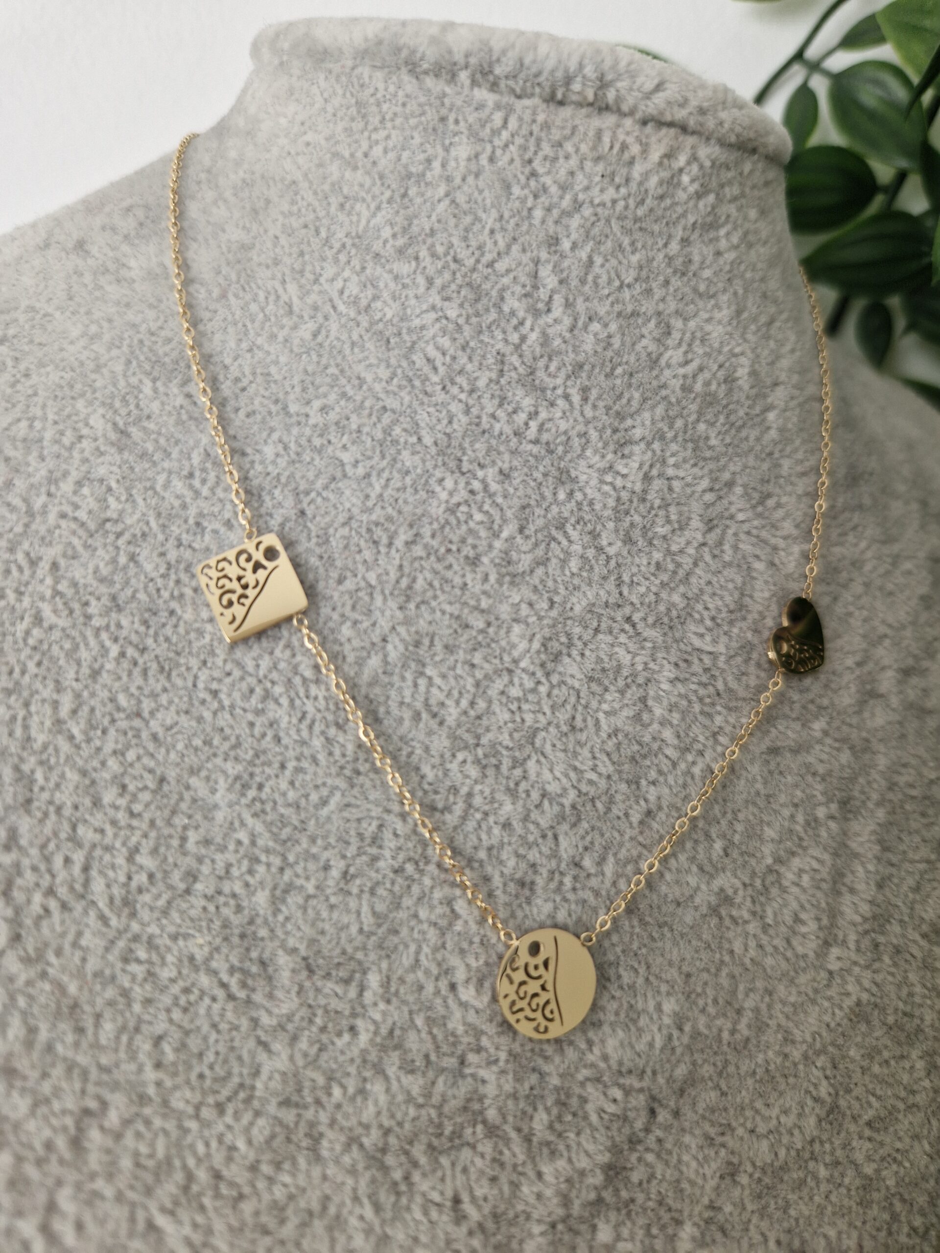 This charming gold necklace features a delicate chain adorned with three heart-shaped charms, each with intricate cut-out designs. Perfect for adding a touch of romance and elegance to any outfit, it combines whimsical charm with sophisticated style.