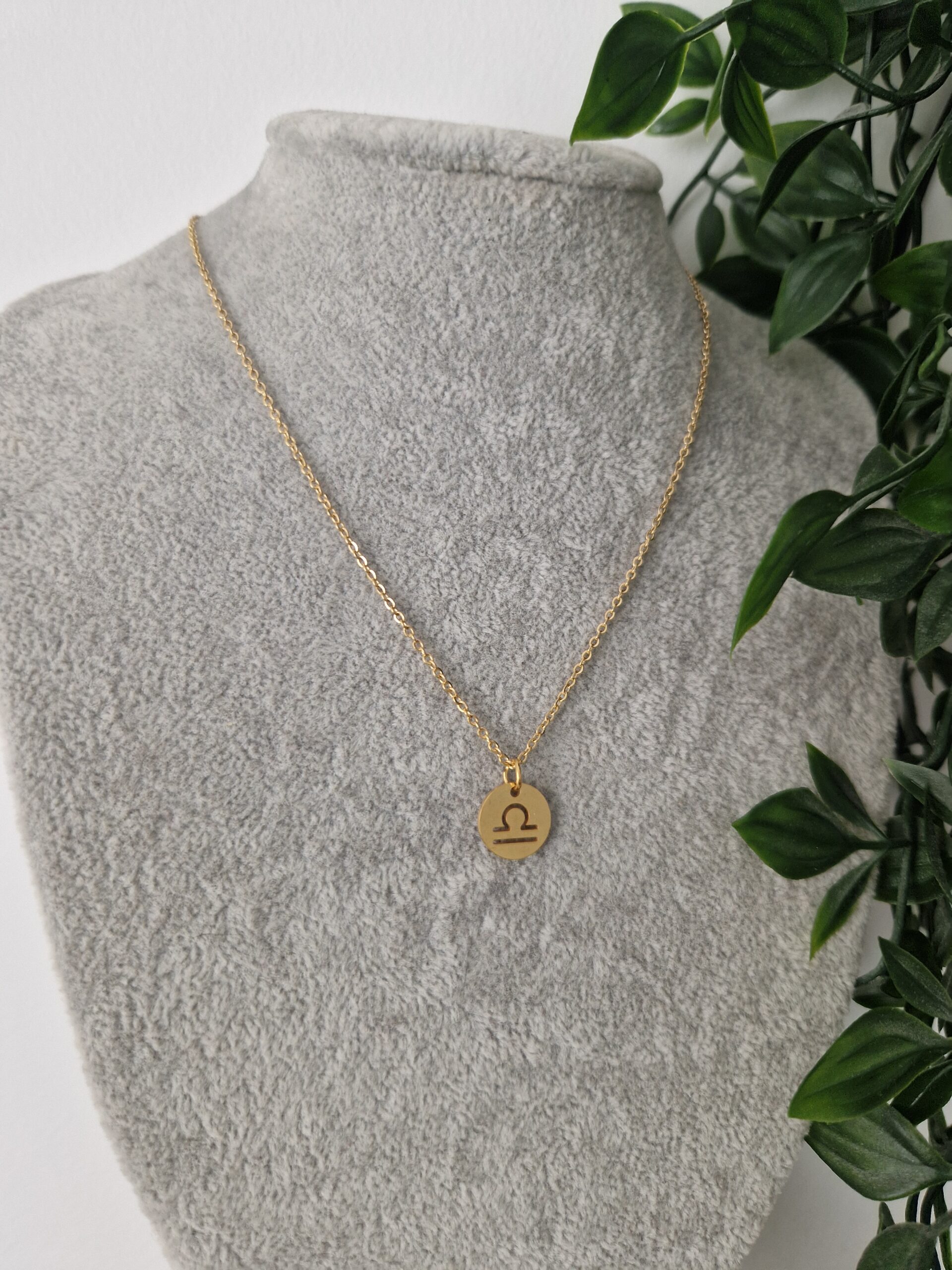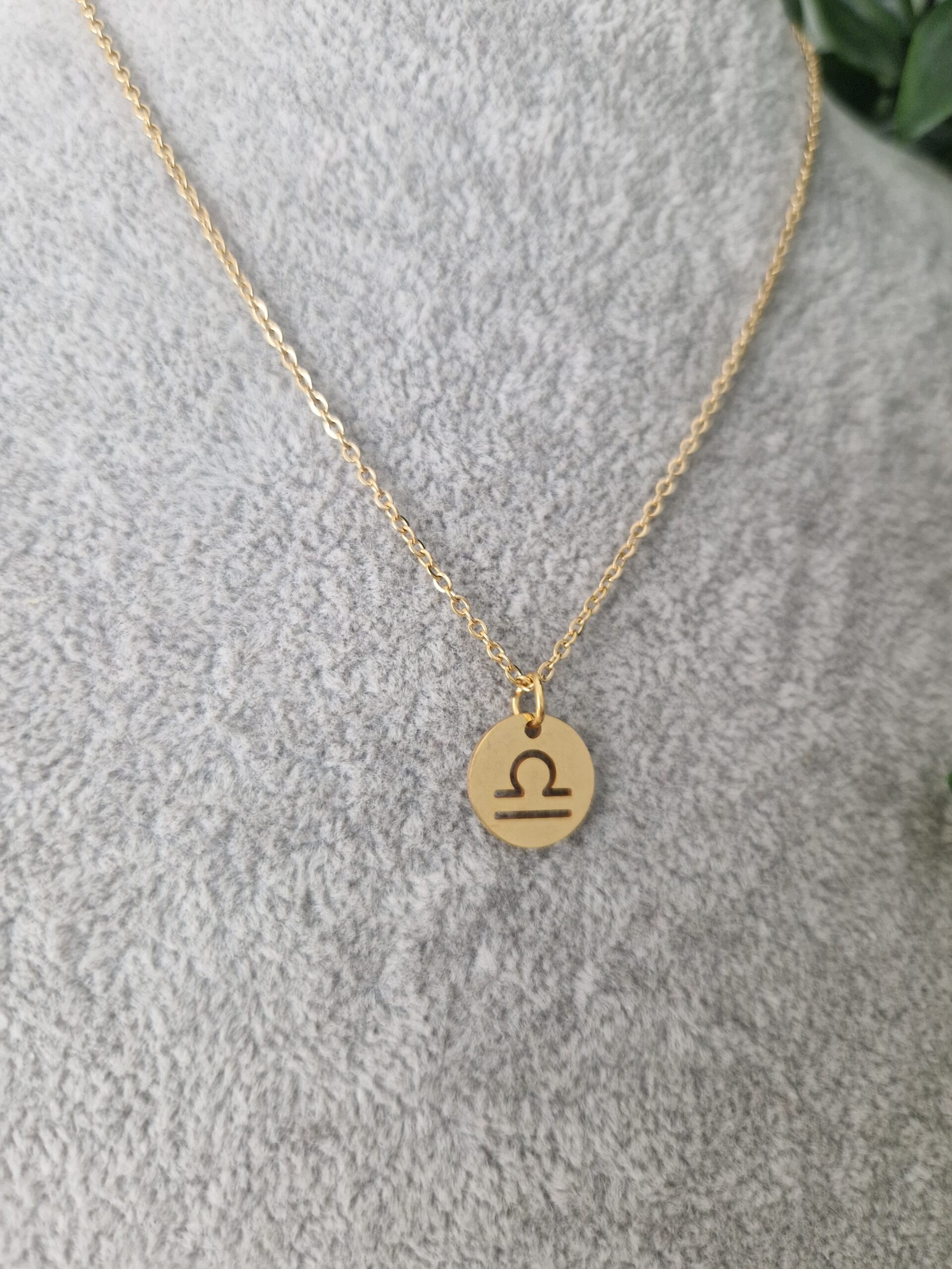 This elegant gold necklace features a delicate chain with a round pendant engraved with the Libra zodiac symbol. Perfect for adding a personal touch of astrological charm to any outfit, it celebrates the balance and harmony that Libras embody.