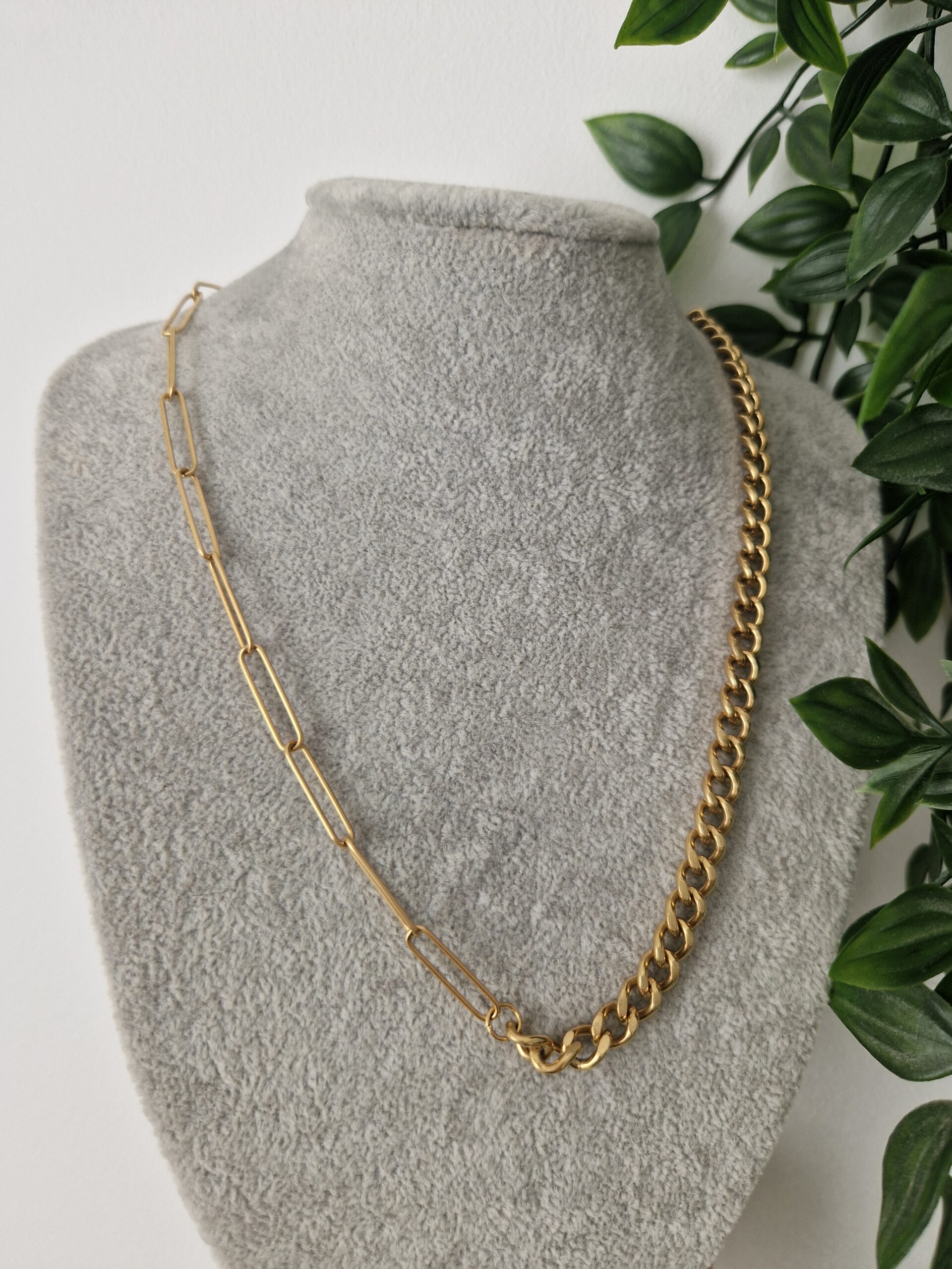 This unique gold chain necklace features a blend of two distinct chain styles: one side with large rectangular links and the other with classic curb links. Perfect for adding a contemporary edge to any outfit, it combines modern design with timeless elegance.