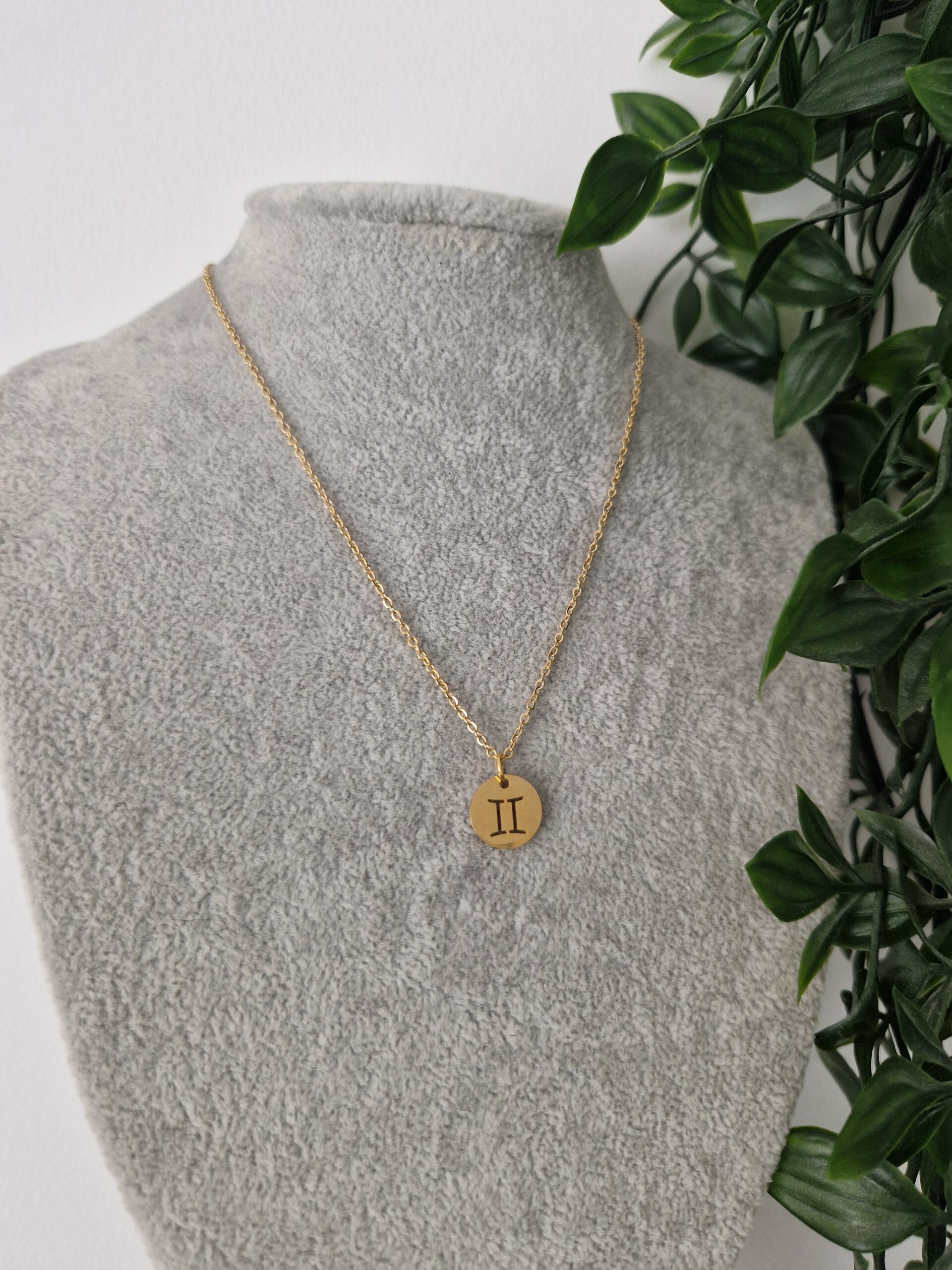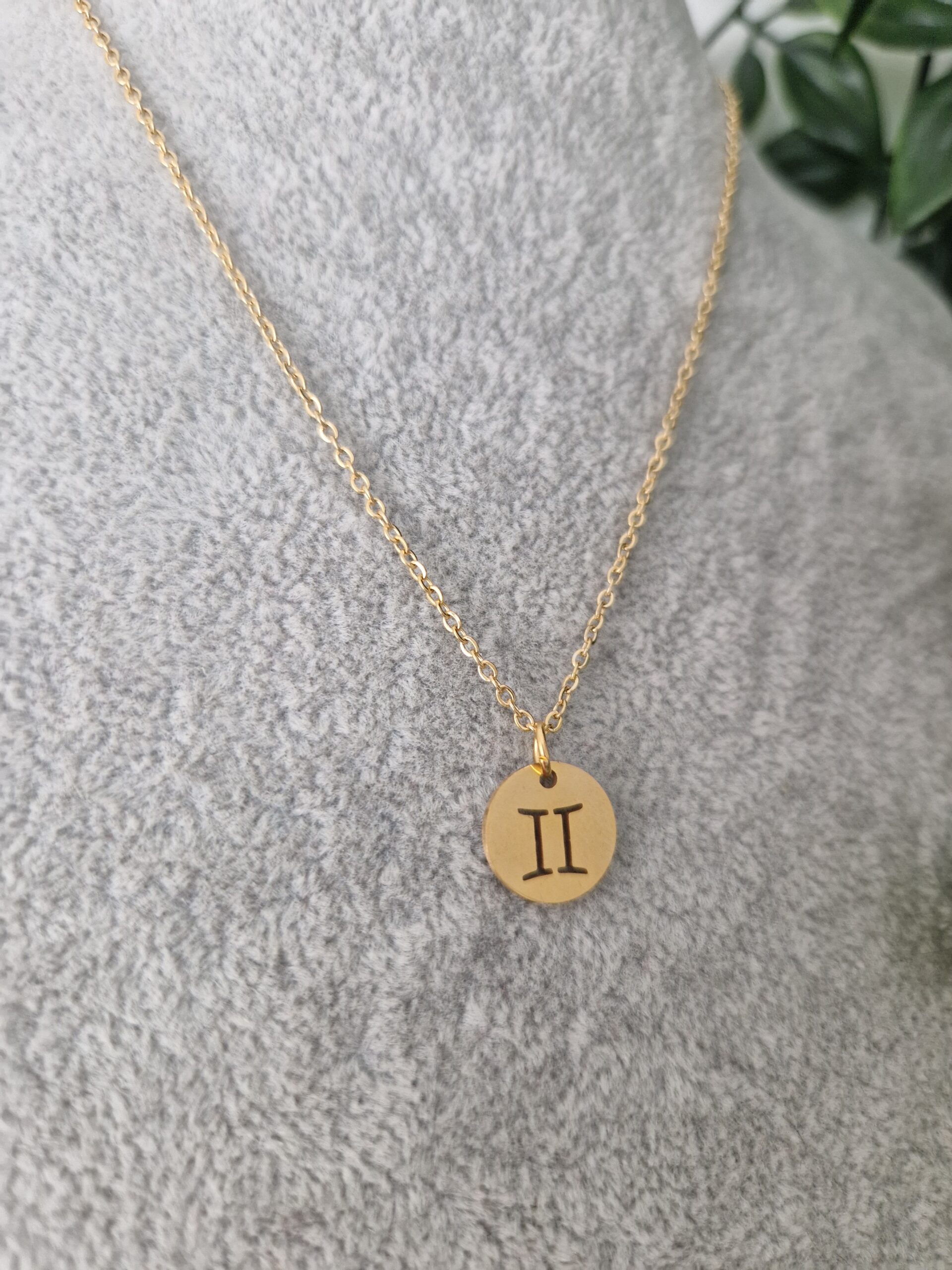 This elegant gold necklace features a delicate chain with a round pendant engraved with the Gemini zodiac symbol. Perfect for adding a personal touch of astrological charm to any outfit, it celebrates the versatility and curiosity of Geminis.