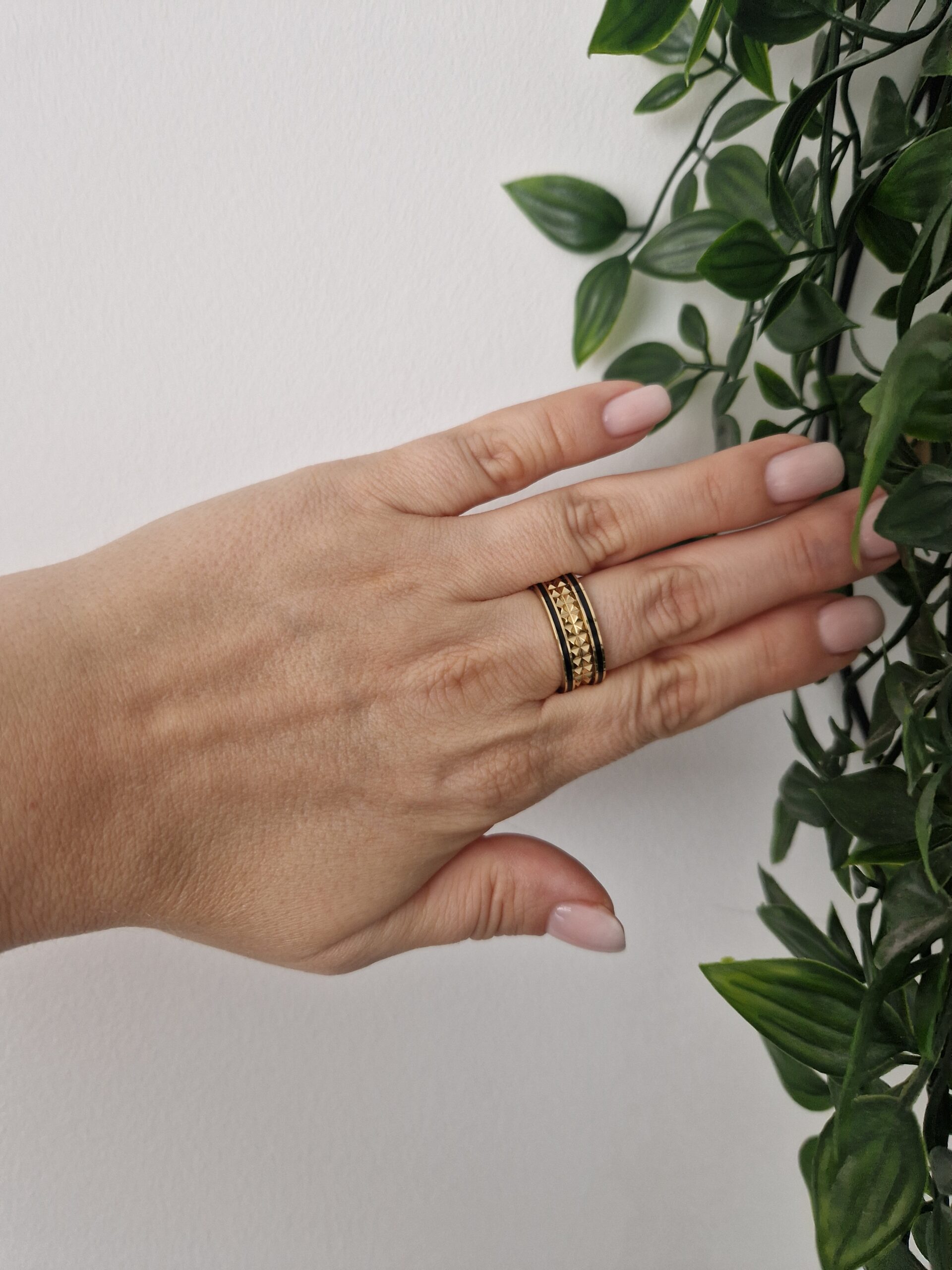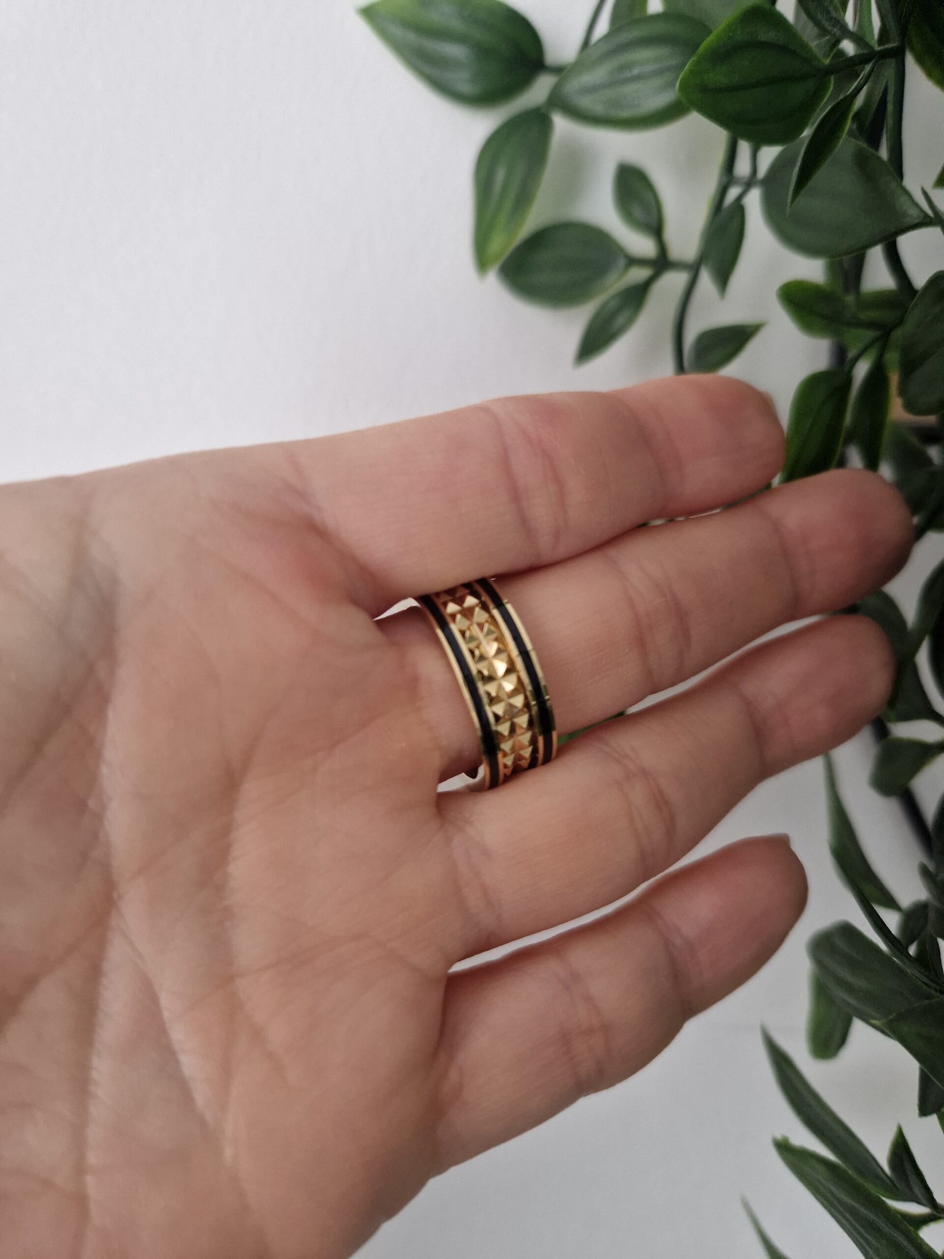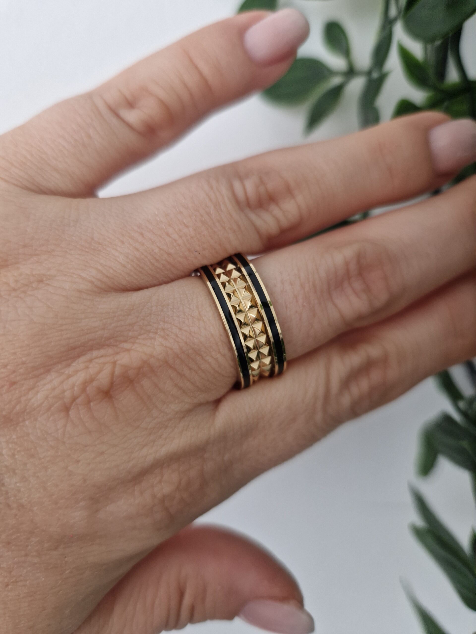 This stylish gold ring features bold black accents, creating a striking and sophisticated look. Perfect for both everyday wear and special occasions, its unique design adds a touch of modern elegance to any outfit. Comfortable and fashionable, this ring is a standout addition to any jewellery collection. Available in size 9.