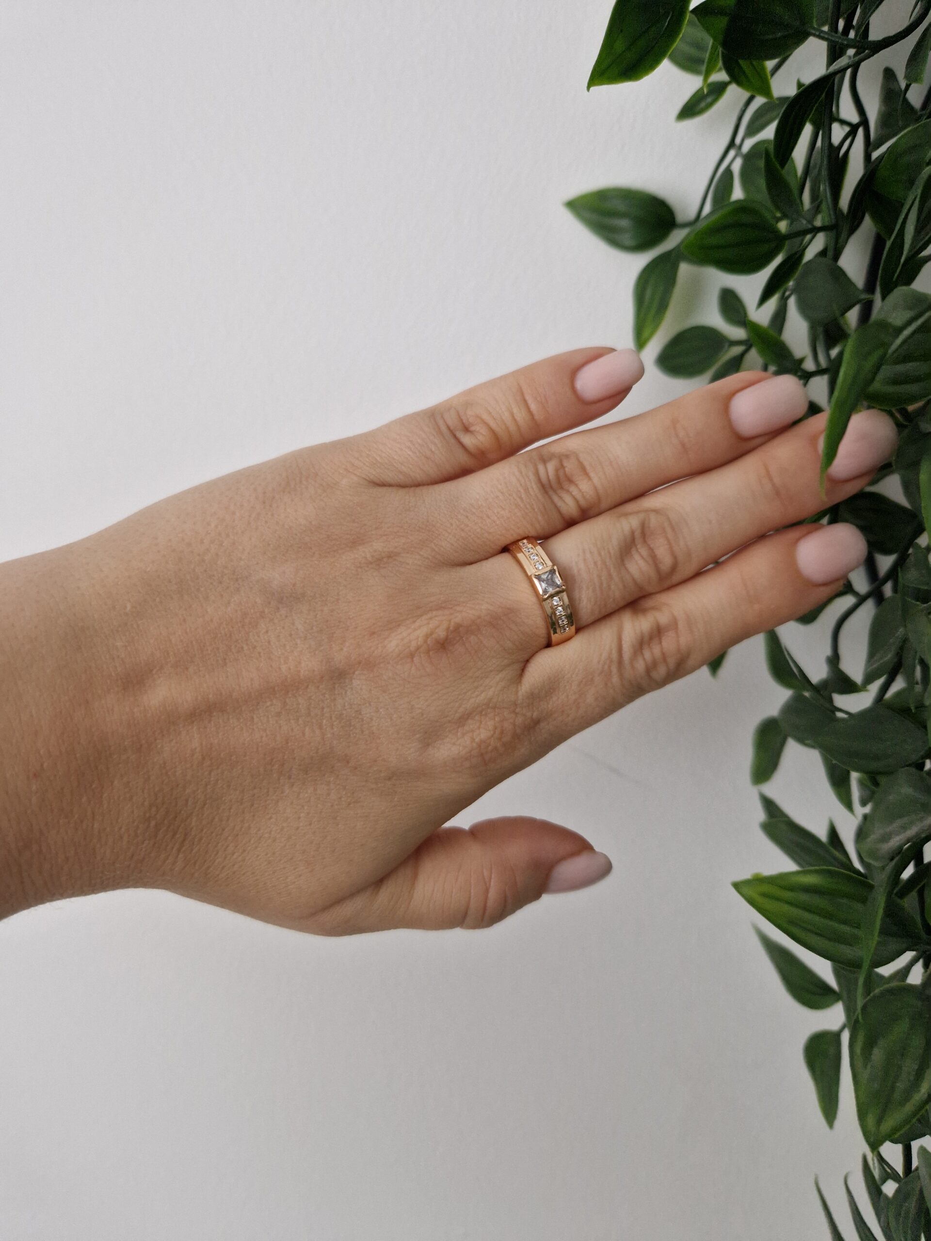 This elegant gold ring features sparkling crystal accents, adding a touch of glamour and sophistication to any outfit. Its timeless design makes it perfect for both everyday wear and special occasions. Comfortable and stylish, this ring is a beautiful addition to your jewellery collection. Available in size 10.