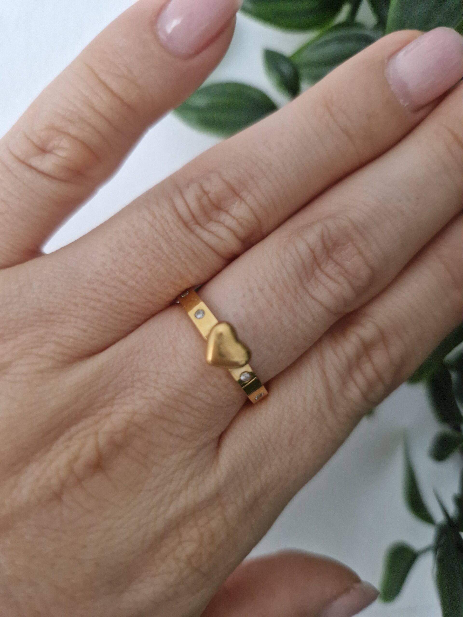 This charming gold band ring features a central heart design, flanked by subtle detailing on either side. Its romantic and playful style makes it a delightful piece, perfect for expressing love and affection or adding a touch of whimsy to your jewellery collection.